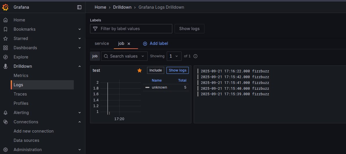 curl -H "Content-Type: application/json" -XPOST -s "http://127.0.0.1:3100/loki/api/v1/push" --data-raw "{\"streams\": [{\"stream\": {\"job\": \"test\"}, \"values\": [[\"$(date +%s)000000000\", \"fizzbuzz\"]]}]}"